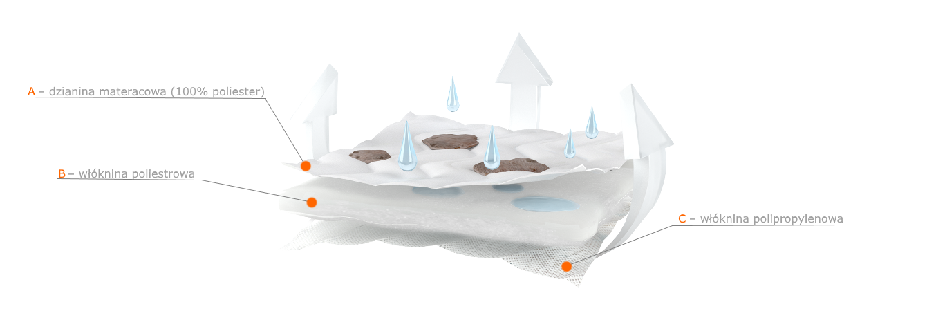 Trójwarstwowego pokrowca (konstrukcja 3W) wykonanego z dzianiny materacowej (100%poliester), puszystej włókniny poliestrowej i płaskiej włókniny polipropylenowej.